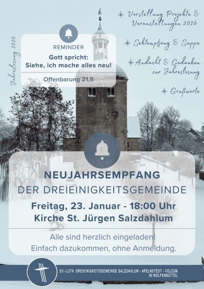 Am Freitag, den 23. Januar 2026 lädt die Dreieinigkeitsgemeinde Salzdahlum-Apelnstedt-Volzum herzlich ein zum Neujahrsempfang. Beginn ist um 18 Uhr in der Kirche St. Jürgen in Salzdahlum. Nach Andacht & Gedanken zur Jahreslosung und Grußworten von Kirchenvorstand und Bürgermeistern geben wir einen kleinen Einblick in geplante Projekte & Veranstaltungen des neuen Jahres. Im Anschluss gibt es eine wärmende Suppe, Zeit & Gelegenheit zum Austausch von Gedanken und Ideen in geselliger Runde.