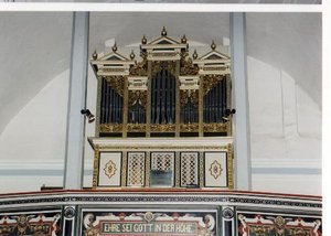 Holzgedackt 8', Koppelflöte 4´, Prinzipal 2´, Sesquialter 2-fach, Quinte 1 1/3, Quintzimbel 3-fach, Krummhorn 8', Tremulant